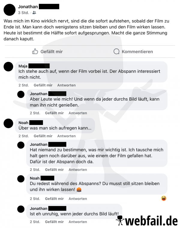 Ein Mann ärgert sich über Kinobesucher.
