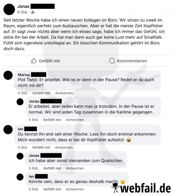 Ein Mann wundert sich über seinen neuen Kollegen.