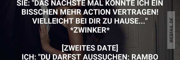Ein junges Mädchen hat mit ihrem Auto einen Platten in der Prärie. Ein Indianer findet sie und nimmt sie mit auf seinem Pferd. Alle paar Minuten stöhnt er laut. Schließlich setzt er sie an einer Tankstelle ab und entfernt sich mit einem letzten Juuuuhuuuu. Fragt der Tankwart: "Was haben Sie denn mit dem gemacht?" "Nichts, ich habe hinter ihm gesessen und mich am Sattelknauf festgehalten." "Junge Frau, Indianer reiten ohne Sattel!!!"